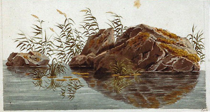 Drei Felsen in einem stehenden Gewässer, mit einzelnen Schilfrohren umstanden.