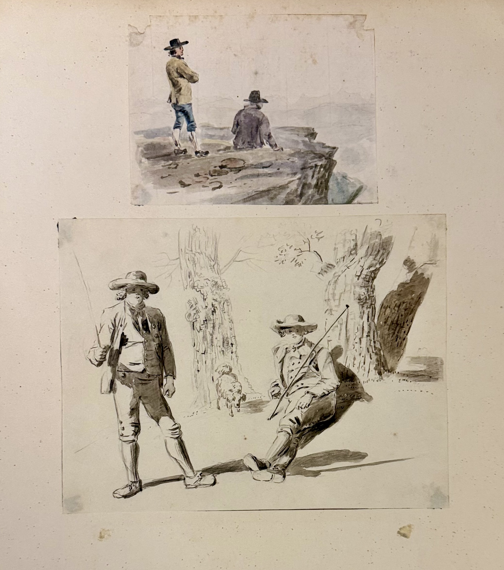 Zwei aquarellierte Figurenskizzen. Oberes Bild ein stehender und ein sitzender Mann auf einem Felsvorsprung. Unteres Bild ein stehender und ein sitzender Mann im Hintergrund Bäume.